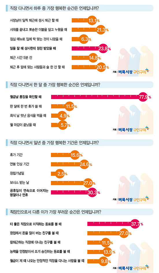 하루 중 가장 행복한 순간은 ‘일을 잘 해 상사한테 칭찬 받았을 때’라고 23.8%가 답해 하루 중 가장 많은 시간을 보내는 직장생활에서
