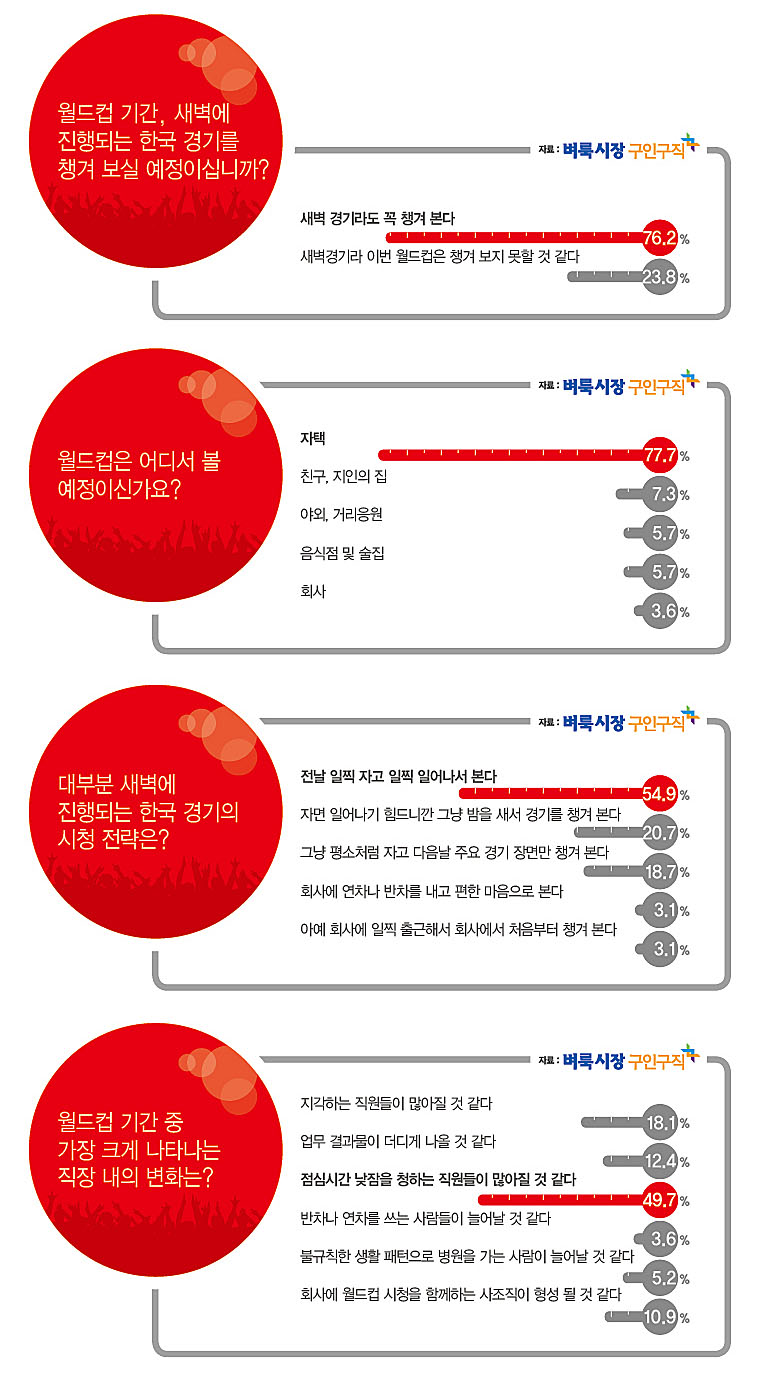 않더라도 월드컵 때 열리는 한국팀 경기는 꼭 챙겨본다는 사람들이 많다. 그렇다면 12시간 시차 탓에 새벽이나 아침에 열리는 브라질 월드컵에 임하는 직장인의 자세는 어떨까?