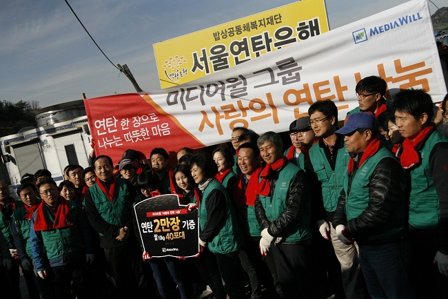 미디어윌그룹은 지난 15일 밥상공동체 복지재단 ‘연탄은행’에 연탄 2만장과 쌀400kg, 라면 40박스를 기탁하고, 임직원 50여명이